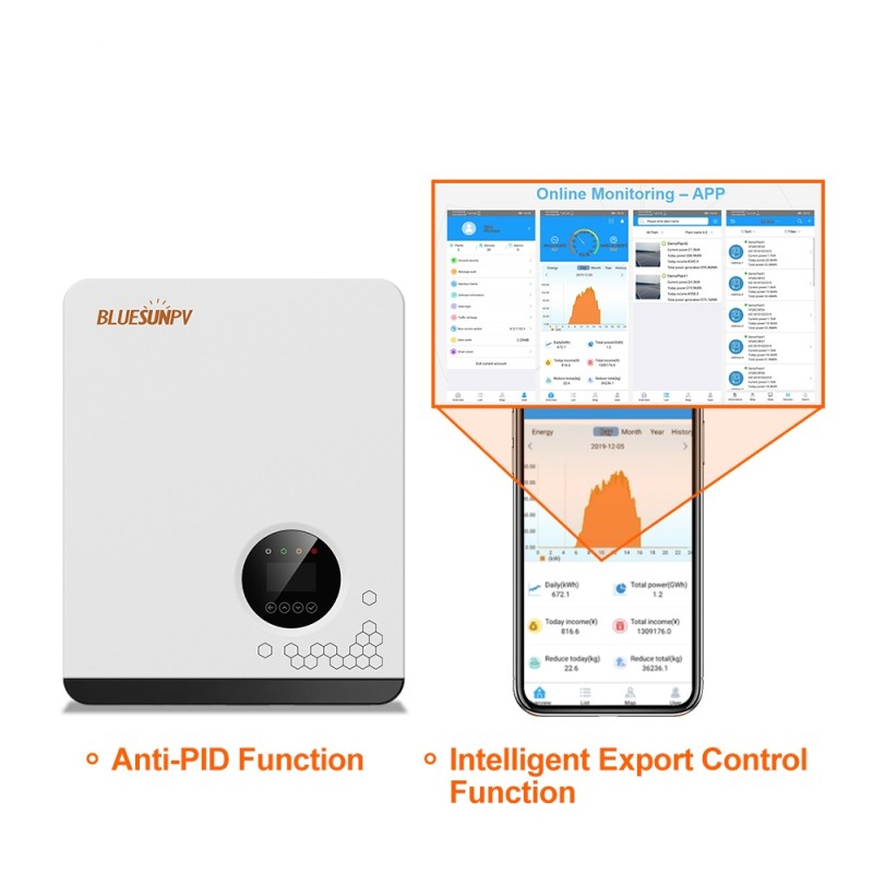 Макс. напруга фотоелектричних пристроїв до 1100 В, SPD типу II постійного/змінного струму. Сумісний з фотоелектричними панелями великої ємності, Wi-Fi / 4g штекер (опціонально).